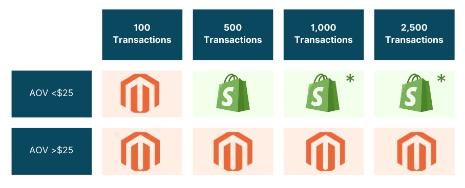 As we said, this is a function of both average order size, transaction cost, and Shopify's monthly fees. Here's a simplified view of how it works out.